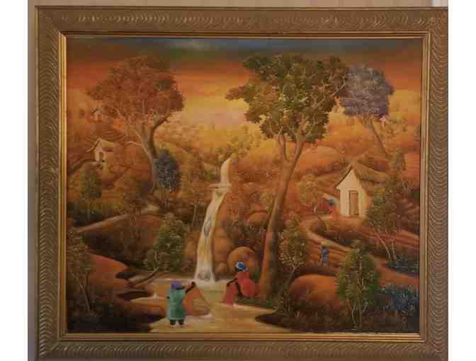 Jacmel Waterfall by Gérald Plaisimond. Acrylic painting. Framed size 23” x 27”.