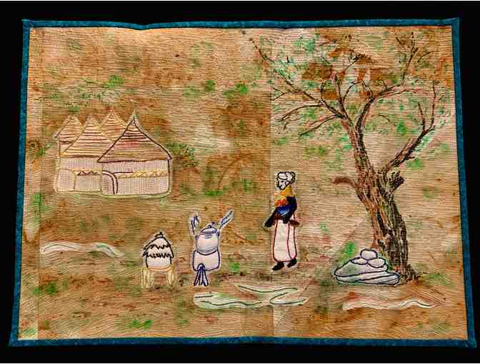 This block was embroidered by a survivor of gender-based violence in the African Country of Mali. It describes life in her village before she was attacked and expelled during conflict.