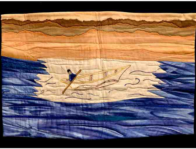 In designing her quilt, Karen was determined not to break up her Malian block or fill out the white space. She was inspired by the fact that some of the sister artists in Mali had crossed two rivers to attend the embroidery training. Karen loves water and takes every opportunity to work it into her quilts.