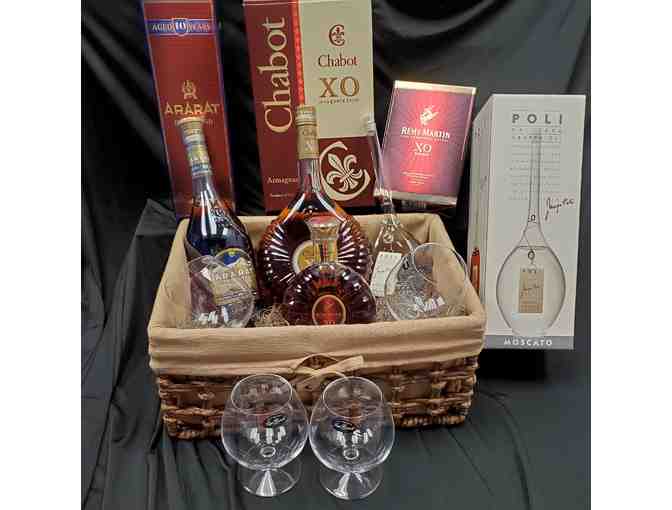 Put your feet up and relax with three other friends. Have a fire in the fireplace. Pour one these varied brandies into the Luigi Bormioli Cognac glasses included in this package. Basket contains: