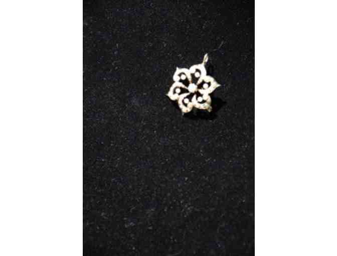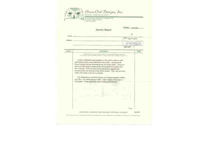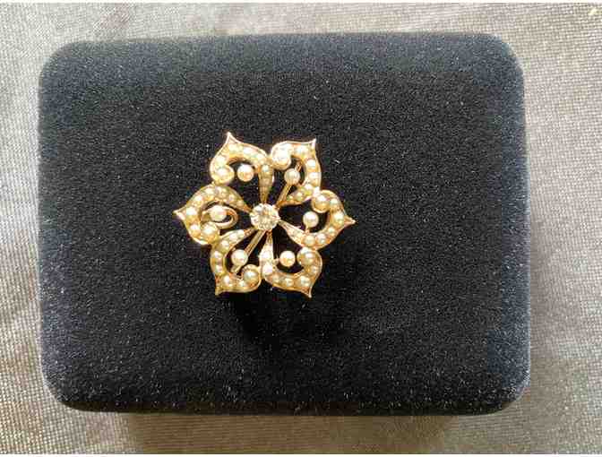 This is a lovely estate Diamond and Pearl pin/pendant. It has an openwork flower design in 14 Karat yellow gold antique with an old mine cut diamond in the center. The diamond is approximately .18 carat and is white and eye clean. There are multiple size seed pearls in the opening of the flower petals. The pearls vary in color: white with cream overtone to pinkish. It has a convertible clasp to wear as a pin or you can add a chain and wear as a pendant. Original Appraisal Included.