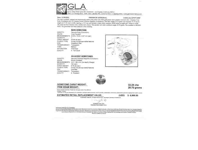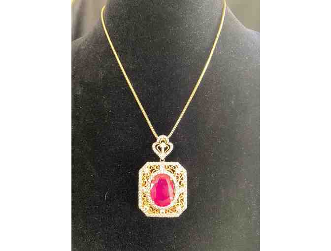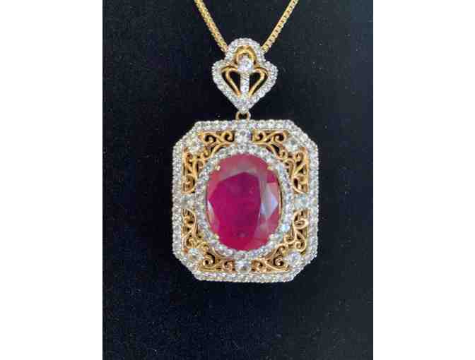 This stunning vintage ruby and sapphire pendant is in a yellow gold-filled setting.  The sterling silver ornate hexagon shaped pendant is on an 18" gold-filled chain. The ruby is 25.48 carats approximately; 20.93x15.63. The ruby is a pinkish red, faceted stone with visible inclusions. Also contained are 122 genuine colorless sapphires of various sizes. Original Appraisal Included.