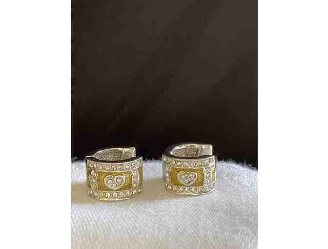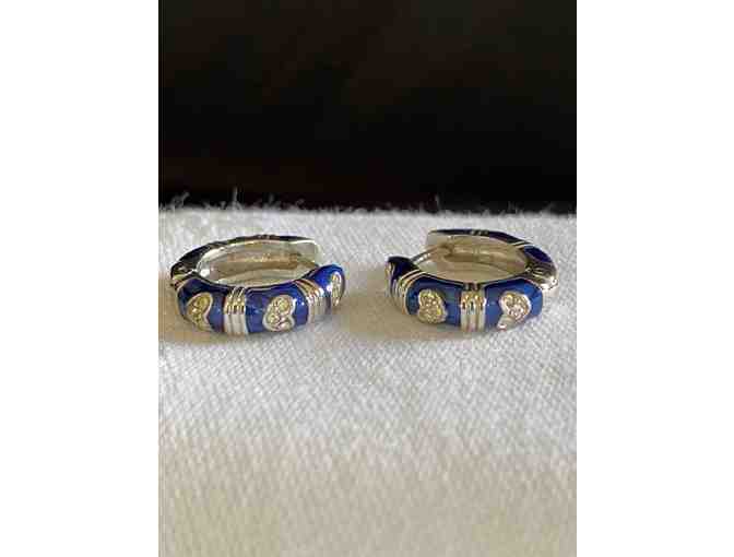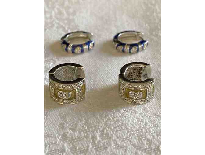 Two pair of vintage enameled silver small hoop earrings with crystals. One pair is silver with navy blue enamel with crystal heart design and one pair is silver with gold enamel with crystal heart design.