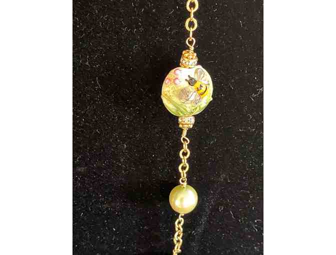 This whimsical estate necklace and earring set has a feeling of spring with bees painted on the beads! The set includes a 37" ceramic bead with Swarovski crystals and dyed freshwater pearl necklace with yellow gold filled links and a toggle clasp. Also includes matching lever back earrings.