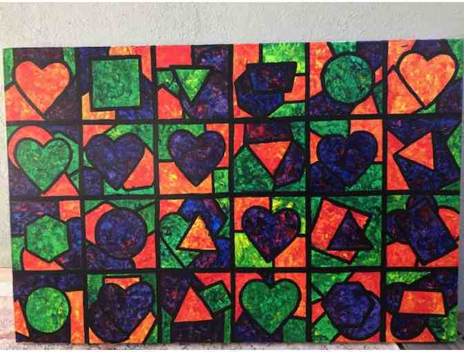 Painting by Mrs Fox's class of vibrant shapes. tudents utilized different layering techniques to create this bold and colorful painting. Materials: Acrylic paint on canvas, 36" x24"