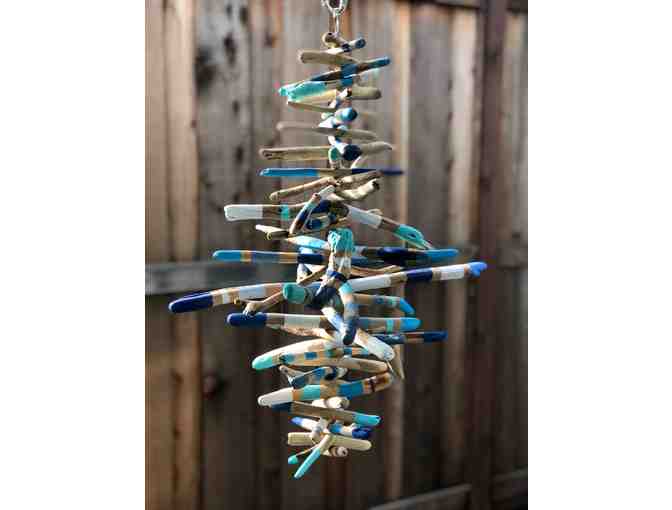 Hanging garland of natural driftwood that the children took turns painting in hues of blue. Looks fantastic Outdoors or Indoors