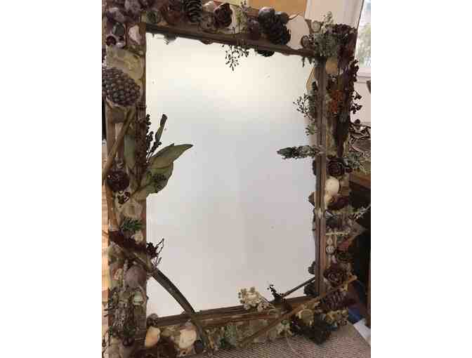 Behold! You are a child of mother Earth. Hand decorated mirror made lovingly by Miss Simonton's fourth grade class. Children collected natural objects and decorated a wooden framed mirror with them. The size is 18" x 24"