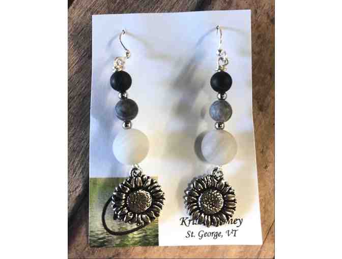 Silver plated pewter sunflower charm with agate and jasper beads. French hook. Approx. 2" long.
