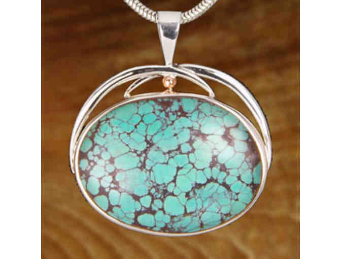 Turquoise pendant set in Sterling Silver.Stone is 28x38mm. Pendant is 1 7/8" x 1 7/8". A Tradewinds original. David McLeod, designer. Chain not included.