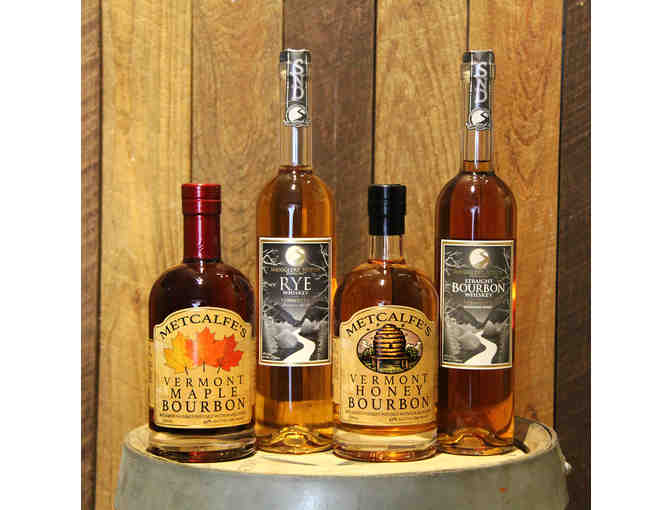 This "Instant Whiskey Bar" includes one (1) bottle each of Smugglers' Notch Distillery Straight Bourbon, Smugglers' Notch Distillery Rye Whiskey, Metcalfe's Vermont Maple Bourbon & Metcalfe's Vermont Honey Bourbon