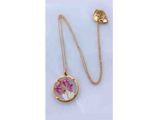 Delicate hand pressed Spring Blossoms are displayed in glass. The pendant is subtly enhanced by a frame of organically styled, softly textured branches. 18k Gold Vermeil 18" Chain Handcrafted in Hawaii