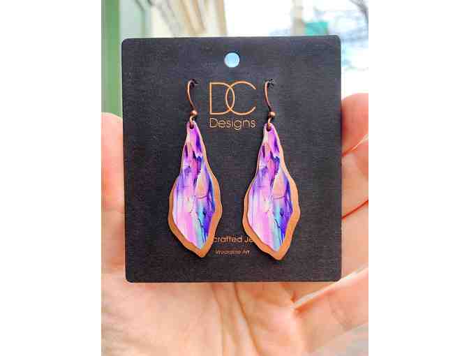 Ultra-light weight & water resistant. Each earring is a handcrafted UV giclée image printed on stainless steel. Brushed copper to accentuate the design. The ear wires are hypo-allergenic, antiqued cooper and contains no nickel. Hand Crafted in Colorado