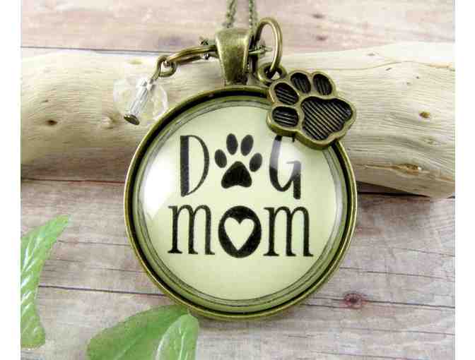 The pendant has a vintage-style cream background, overlaid and sealed with a glass bezel. It is embellished with rustic bronze-finish elegant metal charms and glass beads. 24" chain. Pendant is approx 30 mm.