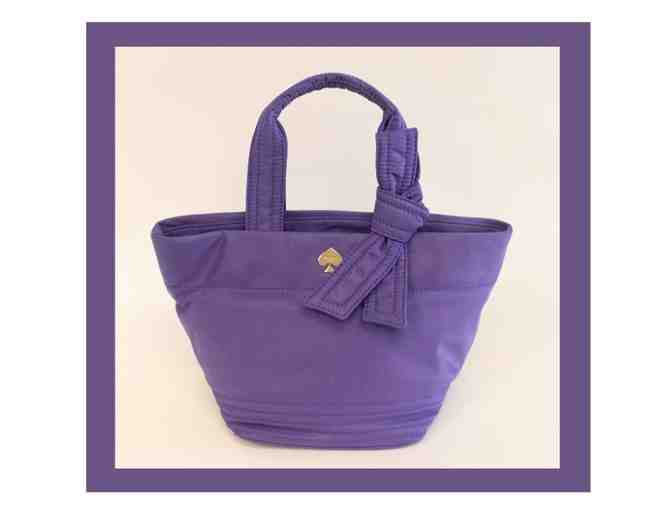 This auction item features a Kate Spade "Hana" Flatiron Nylon Tote in Aster Purple. Inside zip and two multifunction pockets.
