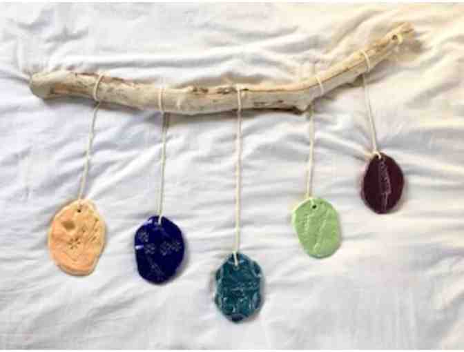 These are driftwood wall hangings of ceramic medallions. On each ceramic is a nature imprint that children in Mrs Schmidt's class made and painted. Art Parents finished them off in the kiln and hung them on the driftwood.