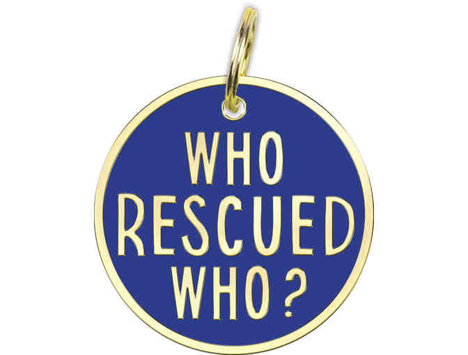 A high-quality, hard enamel pet collar charm featuring "Who Rescued Who" sentiment with an original, hand-illustrated playful design. Features gold metal split ring to attach to a collar.