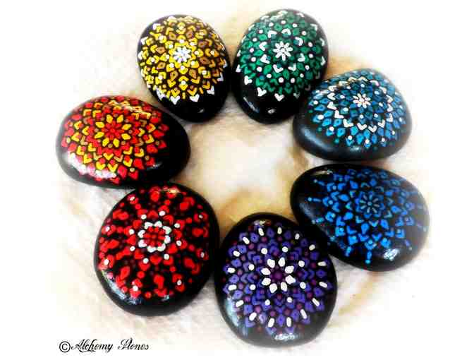 A set of 7 Alchemy "Chakra Stones," hand painted with mandalas in the seven traditional colors associated with the Chakras: Red, orange, yellow, green, blue, indigo and violet.