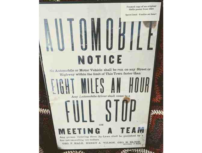 This framed print shows an Vintage Hollis NH speed limit sign, measures 13”x19”.