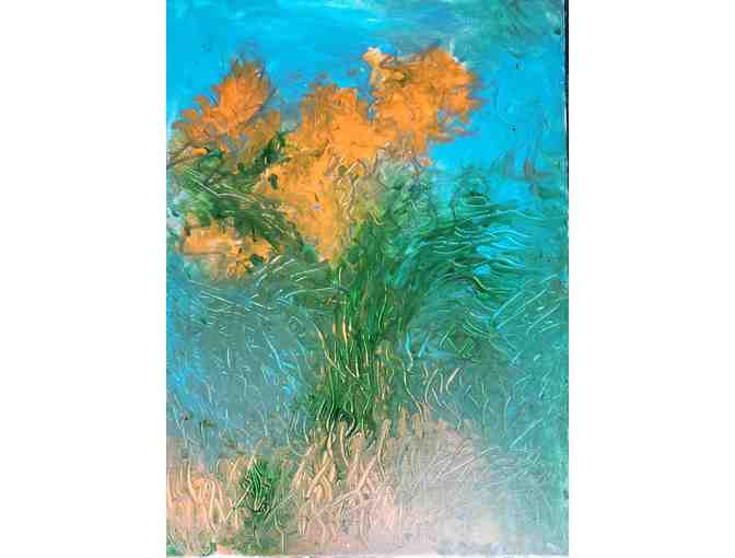 "Sunflowers in the Rain" by North Museum's artist-in-residence Matthew Dougherty. Width by height: 18” x 24”. From the artist: This painting was done with oil paints. It was created outside, while it was raining, during a downpour. The dramatic expressive strokes were done with fingers in some cases. The actual rain wet the canvas while the oil paints, being water resistant, had difficulty sticking to the canvas. It was a struggle, not unlike what we’re going through today, but in the end, the beauty of the beaten down bright flowers shine through.