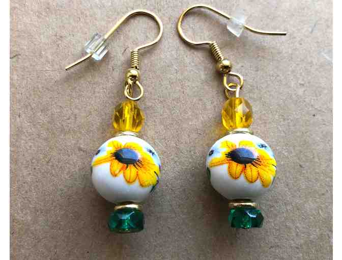 These Harley sunflower earrings were made from white lampwork beads with hand-painted sunflowers, gold and green glass beads, and gold colored hypoallergenic ear wires. It is recommended that they should not be worn while swimming or bathing.