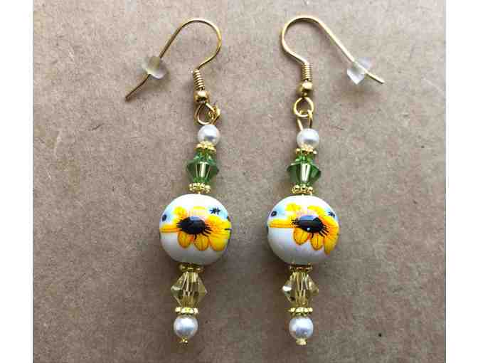 These Harley sunflower earrings are white lampwork beads with hand-painted sunflowers, white pearls, light green and yellow crystals, and gold hypoallergenic ear wires. They are 1.5 inches not including the ear wires. It is recommended that they not be worn for bathing or swimming.