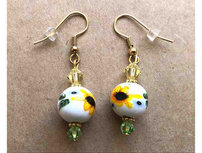 These Harley sunflower earrings were handmade with white lampwork beads with hand-painted sunflowers, light green and yellow crystals, and gold colored hypoallergenic ear wires. They are 1 inch long, not including the ear wires. It is recommended that they not be worn while bathing or swimming.