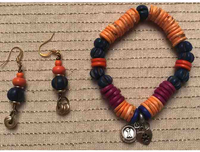 Handmade bracelet with beautiful orange and blue beads and doggy charm. Earrings match the beads used in the bracelet.