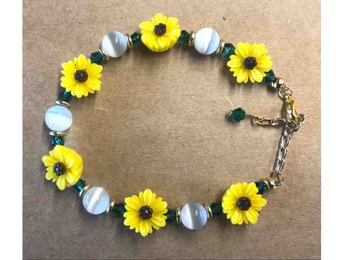 This bracelet is made with resin sunflower beads, white fiber optics, green crystals, and a gold colored extender chain. It will fit wrists approximately 6.5 to 8 inches. It is recommended not to be worn while swimming or bathing.