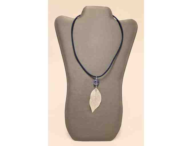 This auction item includes a silver leaf pendant on blue cord.