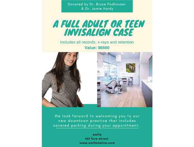 Thank you for bidding on a full Invisalign case donated by Portland's newest boutique practice, smile. Started by Dr. Bruce Podhouser and Dr. Jamie Hardy, these orthodontists wanted to create a luxurious Invisalign experience like no other. From a designer coffee bar, to treatment chairs that offer massage, to local art and a living green wall, this office is designed to mimic a spa atmosphere. There is also complimentary garage parking for the duration of your appointment and a roof-top deck, where you can enjoy sweeping views of Casco Bay before or after your visit.