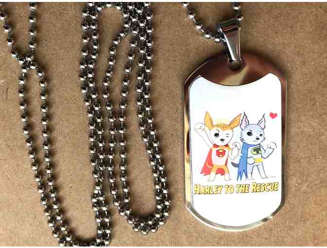Harley & Teddy Superheroes dog tag-style necklace with 30" chain.