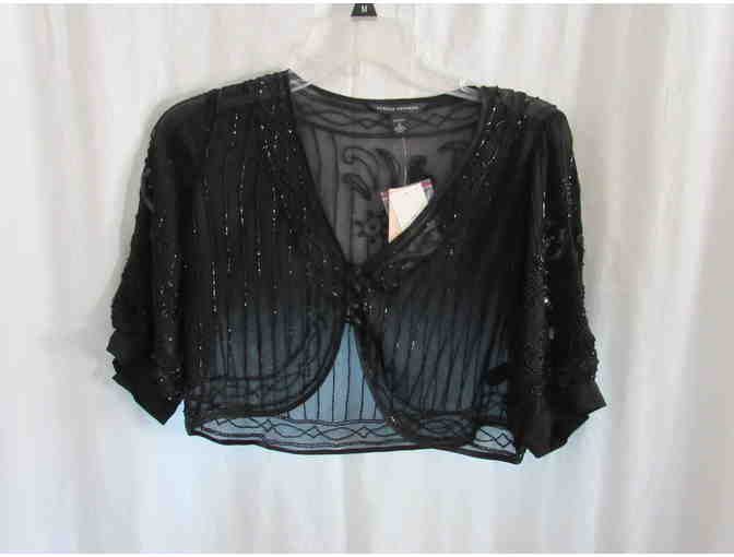This straight, sleeveless, v-neck black beaded dress with an under slip and small jacket will make any evening extra special. Button back closure on dress.