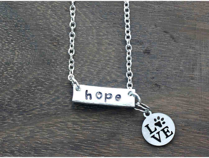 Hand-cut, hammered and stamped aluminum HOPE pendant with 16" chain plus charm.