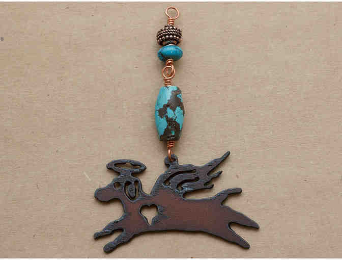 Rustic Iron ornament wrapped with copper wire and accented with turquoise and a copper bead. 4-3/4" high by 2-1/2" wide.