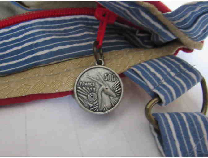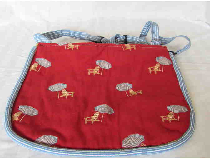This gently used cloth zipper closure handbag will be the perfect item to take to the beach.  Red material with an embroidered chair and umbrella will hold those essentials you need for a day at the beach. Handbag has blue striped adjustable shoulder straps.