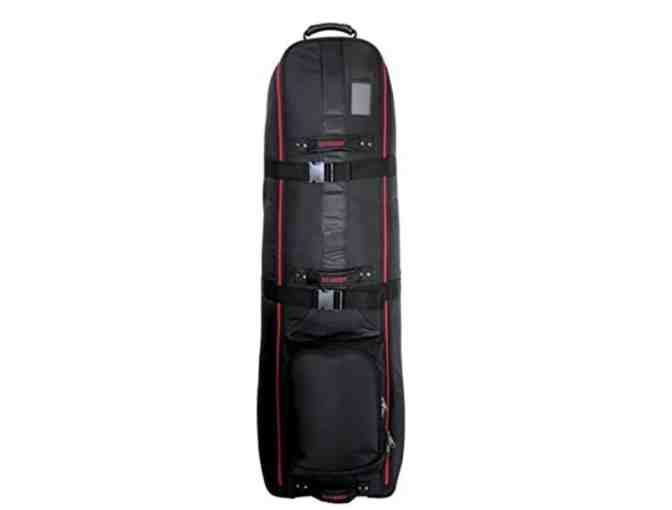 EZ-CADDY golf bag with inline skate wheels, 1680D ballistic nylon for maximum durability, heavy foam padding throughout, wrap-around zipper for easy access, interior straps secure golf bag, and 53" tall, oversized shoe pocket, inline skate wheels, ID holder, heavy-duty skid rails.