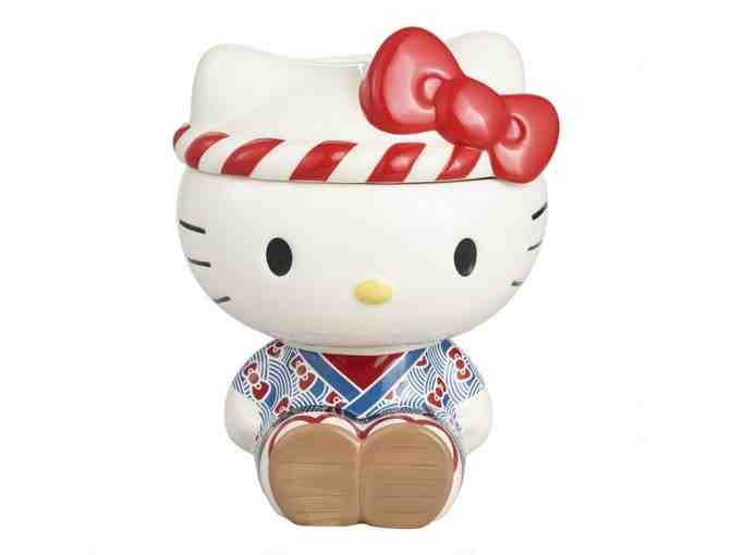 Hello Kitty basket includes cookie jar, Hello Kitty Nigori Sake, pink wallet, Hello Kitty plates, Hello Kitty marshmallow pies, and reuseable bag.Hello Kitty, also known by her full name Kitty White, is a fictional character produced by the Japanese company Sanrio, created by Yuko Shimizu and currently designed by Yuko Yamaguchi. Sanrio depicts Hello Kitty as a female gijinka of Japanese Bobtail with a red bow and, notably, no mouth.