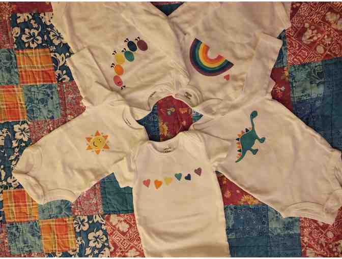 Looking for the perfect gift to welcome a new baby? This beautiful set of colorfully hand-painted baby onesies is just the thing! This "Grow With Me" set of five includes newborn, 3, 6, 9 and 12 month sizes in super soft 100% cotton. Gender neutral and including both short-sleeve and long-sleeve options, these are sure to be a hit!