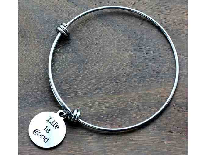 "Life is Good" adjustable stainless steel bracelet. Adult sized (up to 9.5 inch wrist). Charm is 1.5" wide.
