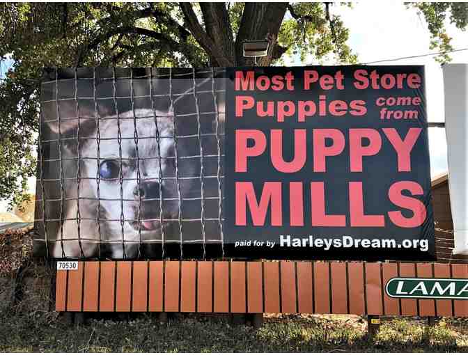 You can help educate MILLIONS of people by helping us advertise on a Harley’s Dream Puppy Mill Awareness billboard. Negotiated special pricing ranges from $1000 to $2,500 per 4-week period, depending on location.