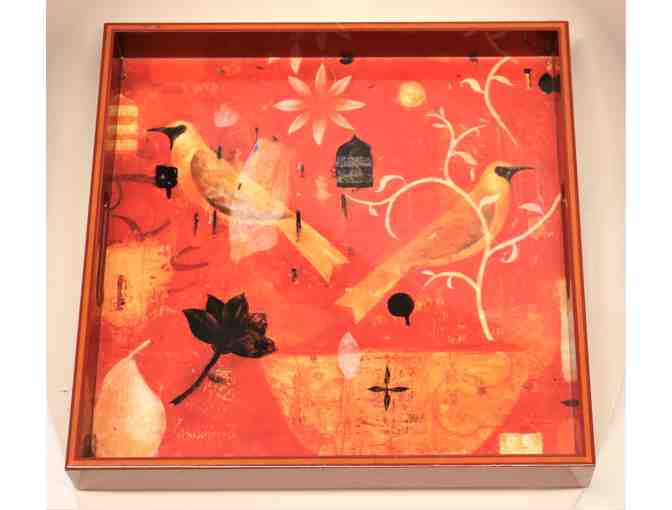 This cheery tray has a high gloss lacquer finish and concealed slot handles. It is moisture and heat resistant (up to 225 degrees F). Perfect for entertaining, to display as art or add warmth to your home decor.