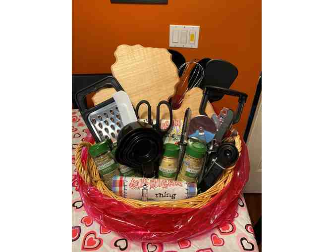 Everything you need for the kitchen! This basket includes kitchen towels, utensil set, organic spices and a cutting board!