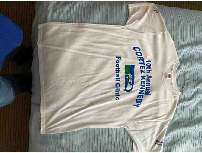 The winner of this item receives a signed Football Clinic camp shirt of Cortez Kennedy. The t-shirt is from the 10th Annual Camp in Mississippi. Kennedy was a Hall of Famer in 2012 and sadly passed away from heart failure in 2017 at age 48.