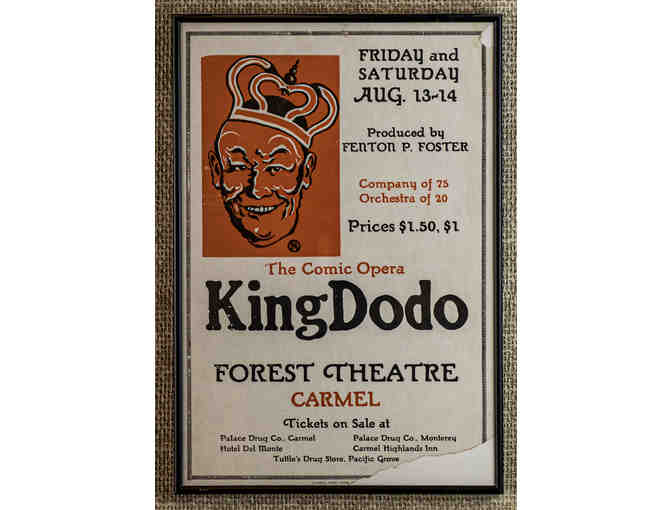 The Comic Opera King Dodo, Forest Theatre, Carmel, Friday and Saturday Aug. 13-14, 1926. Produced by Fenton P. Foster Company of 75 Orchestra of 20 Prices $1.50, $1 Vintage Poster, framed