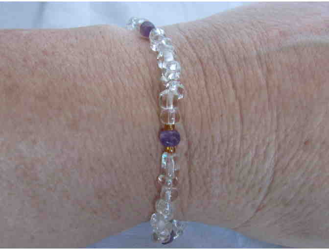 This clear beads with purple and gold accent bracelet will add a little class to any wrist it is resting on.