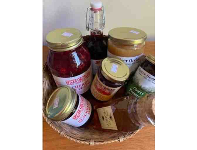 Enjoy a mix of sweets from Spicer Orchards in Fenton, MI. This basket includes: Honey, Blackberry Jam, Cherry Pie Filling, Red Raspberry Jam, Cherry Preserves, Applesauce and Cherry Infused Maple Syrup!