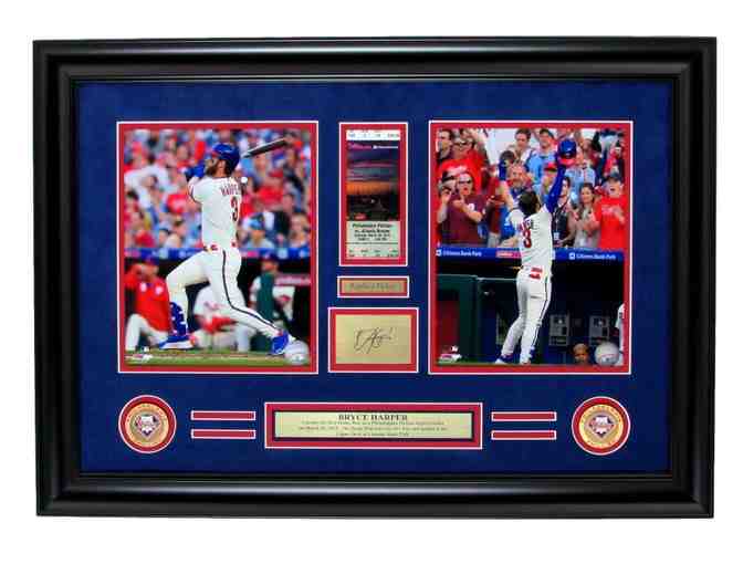 - One Framed Home Run Collage featuring MLB Player Bryce Harper of the Philadelphia Phillies along with Replica Ticket and Laser Engraved Autograph.