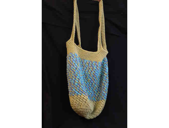 This handmade beautiful crocheted bag is 16" long by 12" wide without including the handles. Use it for the beach or for everyday.