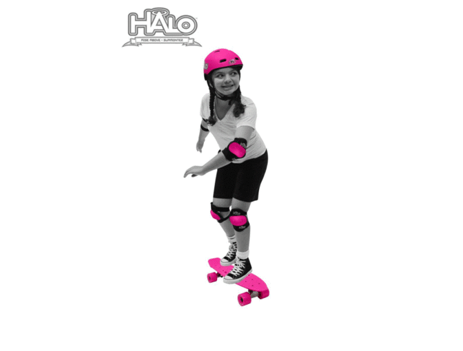 HALO Skateboard Combo Set Includes a Skateboard with built in handle, Multi-Sport Helmet with Adjustable Head Ring and Protective Knee and Elbow Pads! Skateboard is 22.75" long by 6" wide equipped with long-lasting polyurethane wheels, 60mm diameter x 45mm wide, Thickness with high precision ABEC-5 bearings. Deck made with high density PP material!