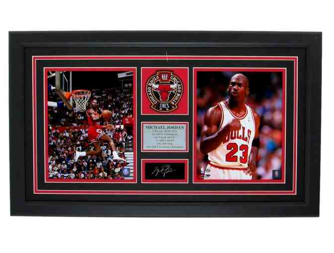 - One (1) Michael Jordan Bulls Unsigned Framed Collage with Laser Engraved Autograph.